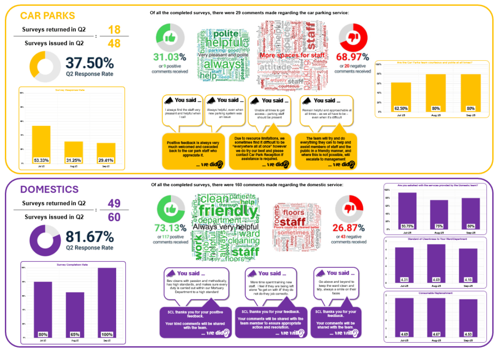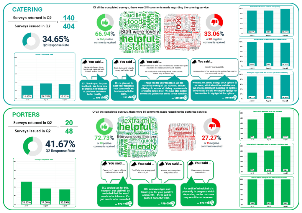 Following the successful introduction of the Catering survey in Q2 2023/2024 at the University Hospital of North Durham (UHND), the SCL Contract and Performance team launched a series of surveys for each of SCL’s services at UHND.